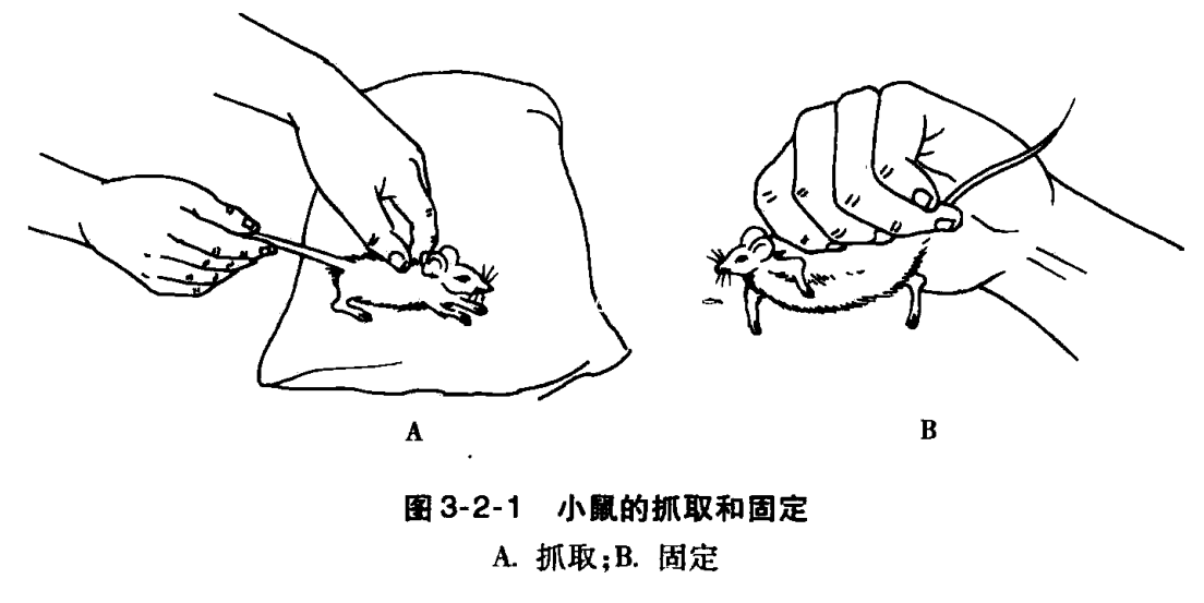 特点: 小鼠温顺,一般不会咬人 抓取步骤: 抓取时先用右手抓取鼠尾提起,置于鼠笼或实验台向后拉 在其向前爬行时,用左手拇指和示指抓住小鼠的两耳和颈部皮肤 将鼠体置于左手心中 把后肢拉直,以无名指按住鼠尾,小指按住后腿即可 有经验者直接用左手小指钩起鼠尾 迅速以拇指和示指、中指捏住其耳后颈背部皮肤亦可(图3-2-1)。